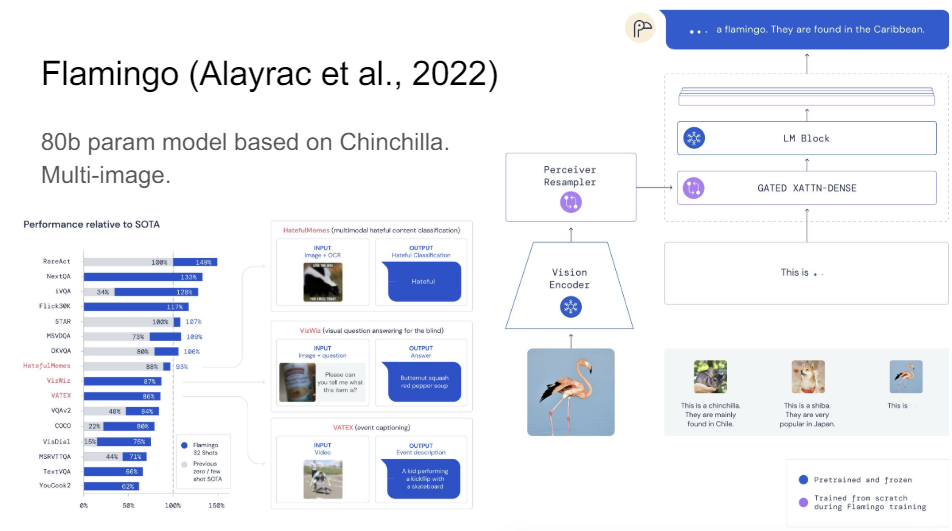 So I think that's very cool. Then probably one of the coolest papers right now or models right now that you might have heard of if you follow the field is Flamingo, out of DeepMind, where they take a Chinchilla language model. So this is really an optimal language model.