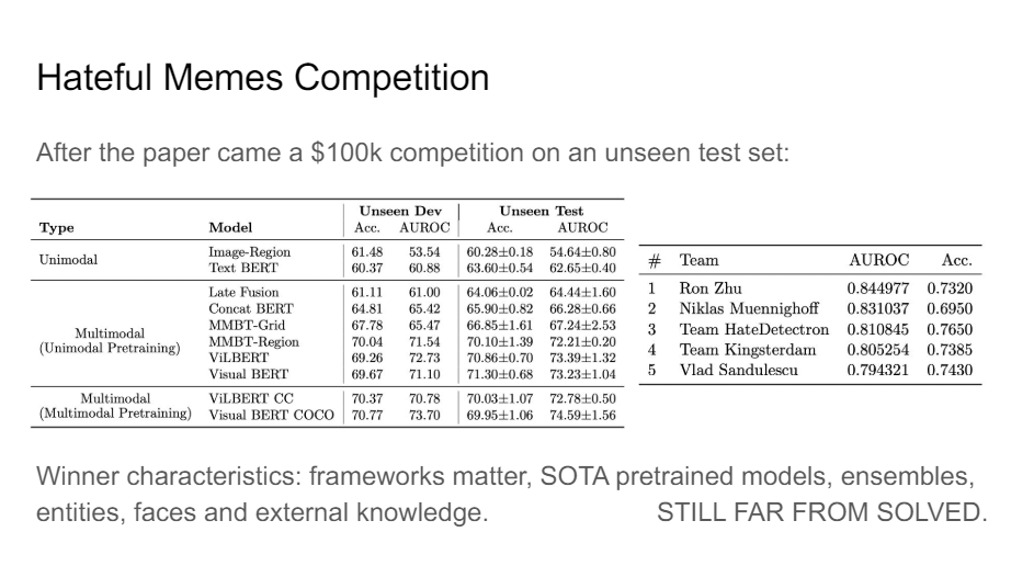 So if you wan to solve this, if you want to classify this correctly for the meanness, then you have to really understand multimodal reasoning. You have to understand the relationship between the image and the text in order to get to the right label. And so it was really constructed by design to do that.
