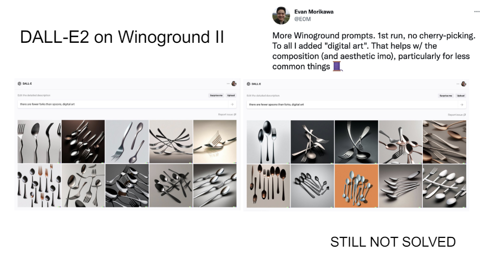 So when DALL-E2 came out-- it's like Stable Difusion but then before Stable Diffusion. And so this was really the first model that really showed just how impressive these generative models can be when they're creating images. So there's a mug in some grass. You do have to kind of cheat a little bit because you have to add digital art here. If you don't add that then it breaks down completely. So it's sort of prompt hacking, I think, or sort of tuning on the test set, but OK.