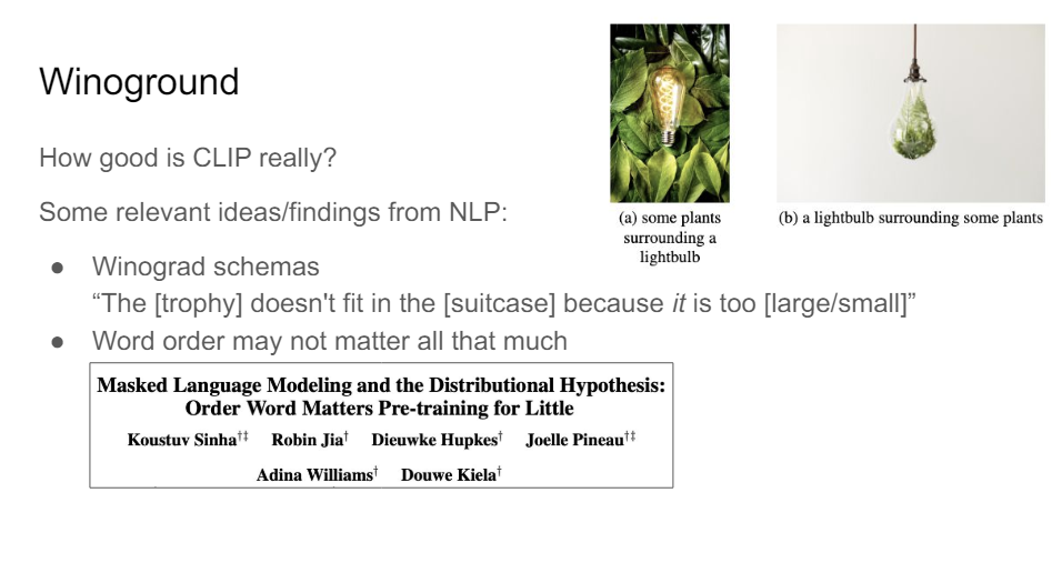 So this data set Winoground, we were trying to figure out, OK, how good is CLIP actually? So it looks really amazing and it's way better than things that were previously there, but does it understand compositional relationships in the same way that humans would understand it, or is it just sort of fitting onto the data distribution and it can be very good at the head of the distribution but is terrible at the tail?