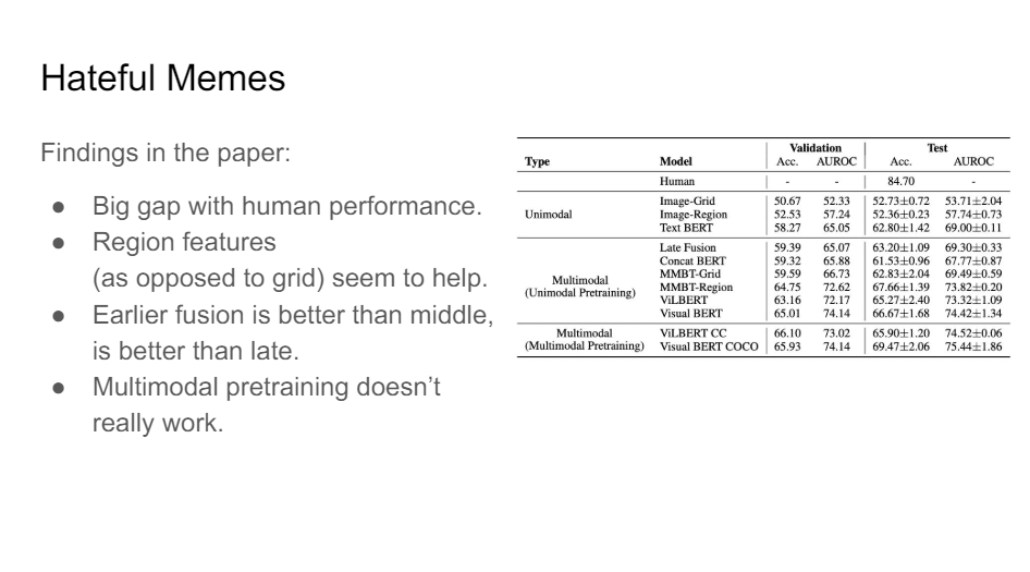 So maybe it got you one point extra from visual BERT to a different visual BERT, like less than a point just by doing that multimodal pretraining. So that means we still have to figure this stuff out.