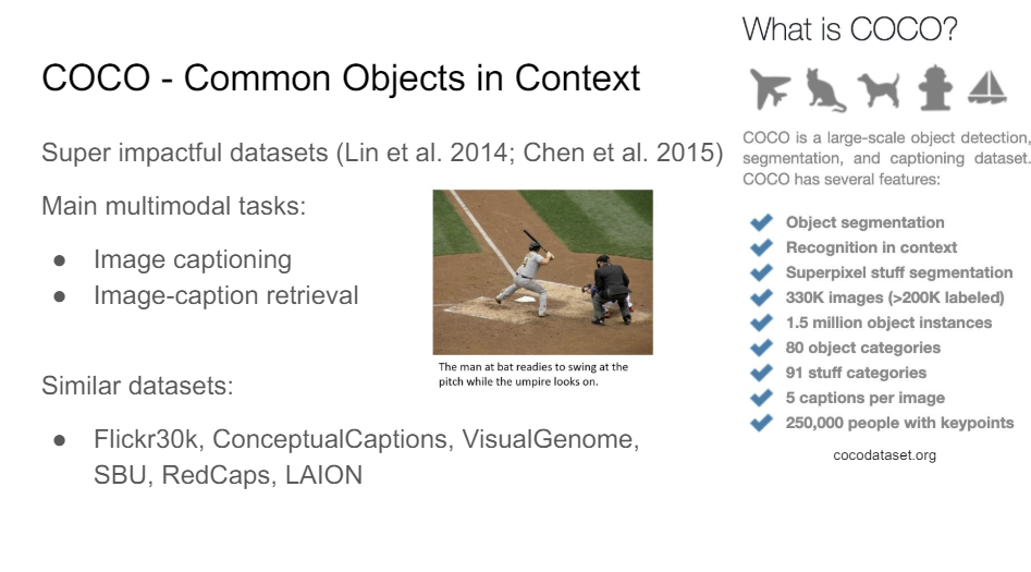 There's this amazing project. So ImageNet really changed the history of deep learning. And this other data set CoCo, also really changed, especially vision and language, but also I think vision, in general, where they have just a bunch of main sort of multimodal tasks.