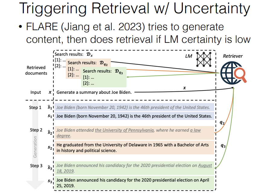 Another option is, to trigger retrieval with uncertainty estimates. So FLARE where we try to generate content and then do retrieval if the language model certainty is low.