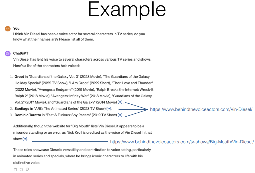 THis is in fact implemented in many or even most language modeling providers including OpenAI. So to give an example, I asked the question and ChatGPT gave me an answer, and you can see that ChatGPT's answer includes several places with quotes. If you click on the quote, it tells you where the information source came from.
