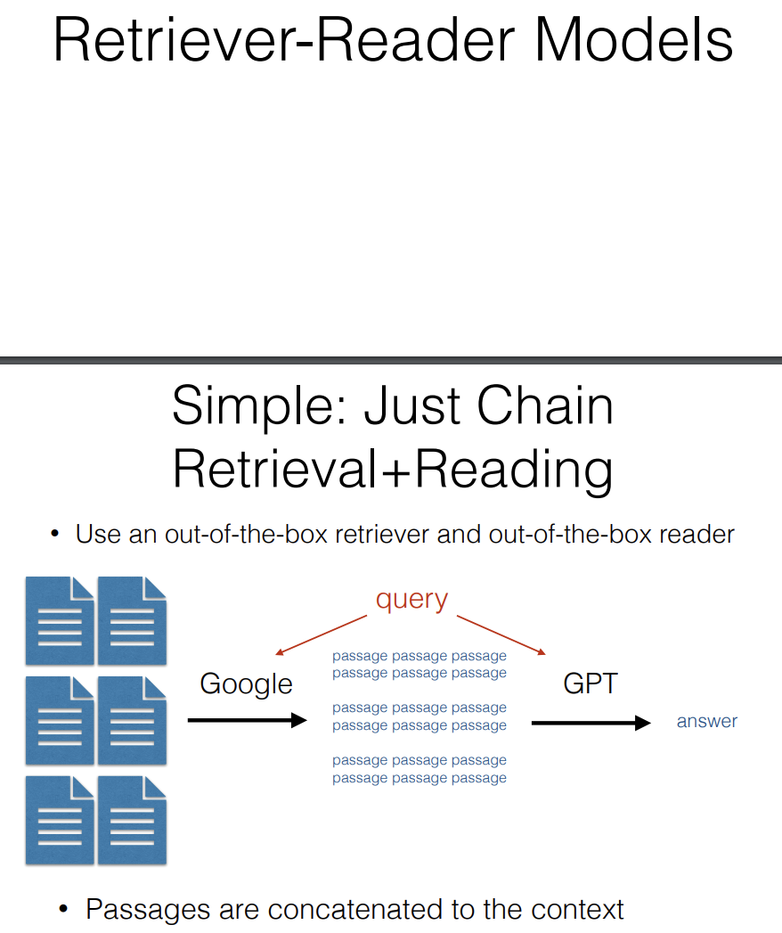 We have Retrieval-Reader models. The simplest way they can work is you just chain retrieval and reading together. So you use an out-of-the-box retriever and out-of-th-box reader model. You have your query, you could look something up on Google, get a whole bunch of passages and then feed them into a GPT model and get an answer. This overall is quite effective, it's easy to implement and it will give you decent results.