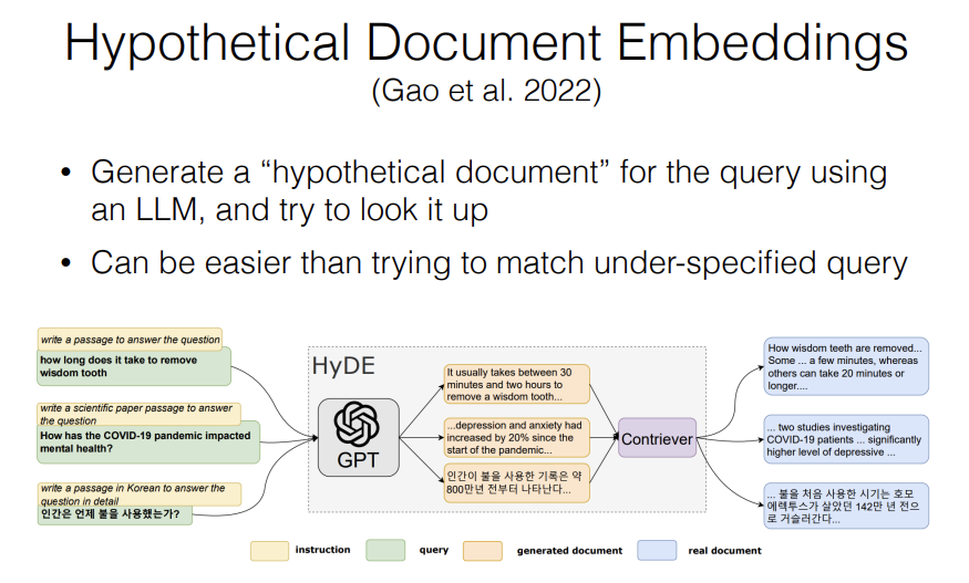 The idea behind a "Hypothetical Document Embeddings" is that its's actually somewhat difficult to match a query and a document. Because a query is a very short possibly ungrammatical output that's asking a question and then a document is a very long output that's written in a different style and, it might have lots of irrelevant information. So the idea behind a Hypothetical Document Embeddings is that it's easier to match a document in a document than it is to match a query in a document.