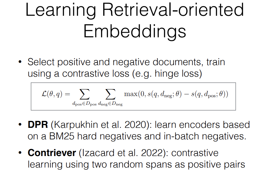 So how we learn Retrieval-oriented Embeddings? The normal way we do this is we select positive and negative documents and then train using a contrastive loss.