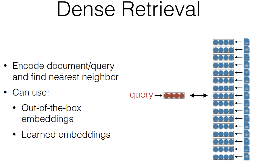 The way Dense Retrieval works is, you encode the document and query into a dense vector, and find the nearest neighbor. In order to do this encoding, you can use a number of things. You can use Out-of-the-box embedings or you can use Learned embeddings specifically created for the purpose of retrieving.