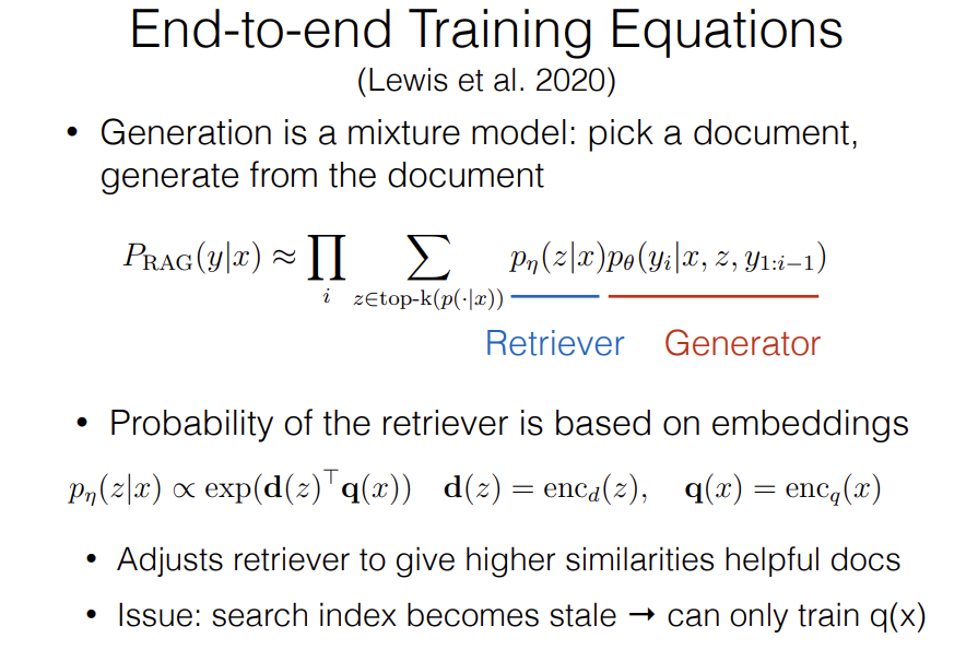 One important issue when training models like this is that, the search index will become stale so what do I mean by this, it's fine to do lookup over big index but if you start updating this document embedding, you need to recreate the entire index and that would be very computationally costly.