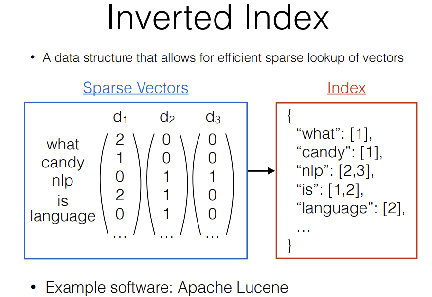 Now that we have this term based sparse vector, we would like to use this to look up relevant documents in a collection very quickly because we might have a collection that's extremely large as large as the entire internet like what Google is doing when it searches. So in order to solve this, we need a data structure that allows for efficient sparse lookup of vectors.