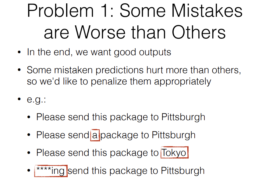 So first one is that some mistakes are worse than others. In the end, we want good outputs and some mistaken predictions can be a bigger problem for the output being good.