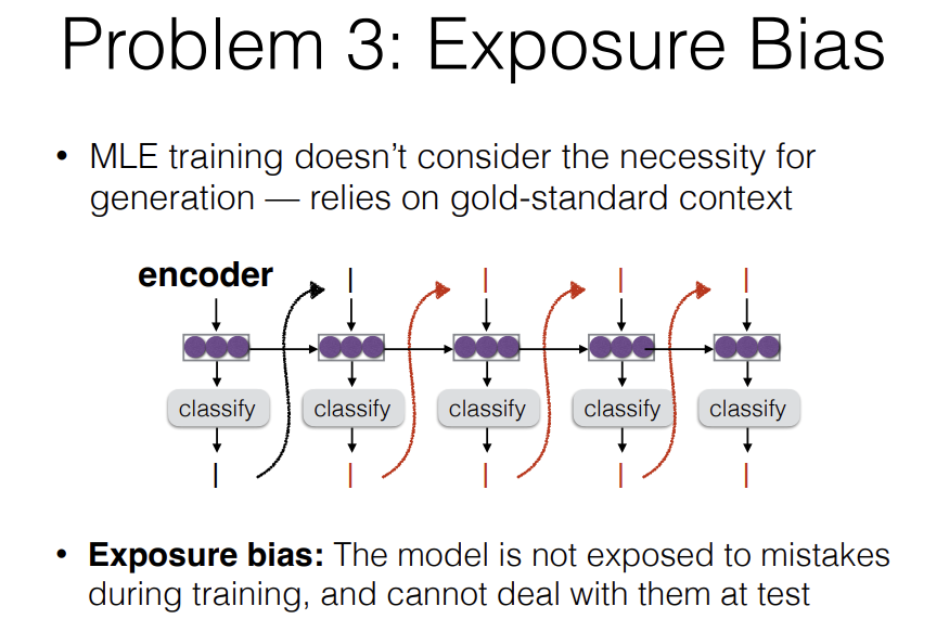 So "exposure bias" is that the model has never been expose to mistakes in the past and so it can't deal with them. So what this does is, if you have an alternative training algorithm, you can fix this by generating a whole bunch of outputs, scoring some of them poorly and penalizing the model for generating poor outouts. That can fix these problems as well.