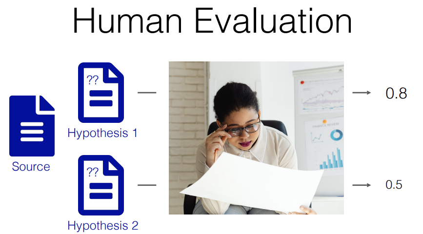 In this case, one of our gold standards is Human evaluation. So we might have a source input like a prompt or an input text for machine translation, we have one or several hypotheses, and we ask a human annotator to give a score for them or do some other annotation.