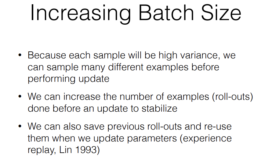 There's a lot of reasons why it's unstable. The first reason is you're sampling individual output and calculating based on the individual sampled outout and then there's an infinity of other outputs that you could be optimizing over. For MLE, this is not a problem because for MLE, you're always contrasting the gold standard output to all of the other outputs in the space and you're saying, I want to upweight the gold standard output and down all the other ones. But for reinforcement learning, you only have a single sampled output that output might be wrong and that's a source of instability. This is particularly a problem when using bigger output spaces like all of the words in the vocabulary.