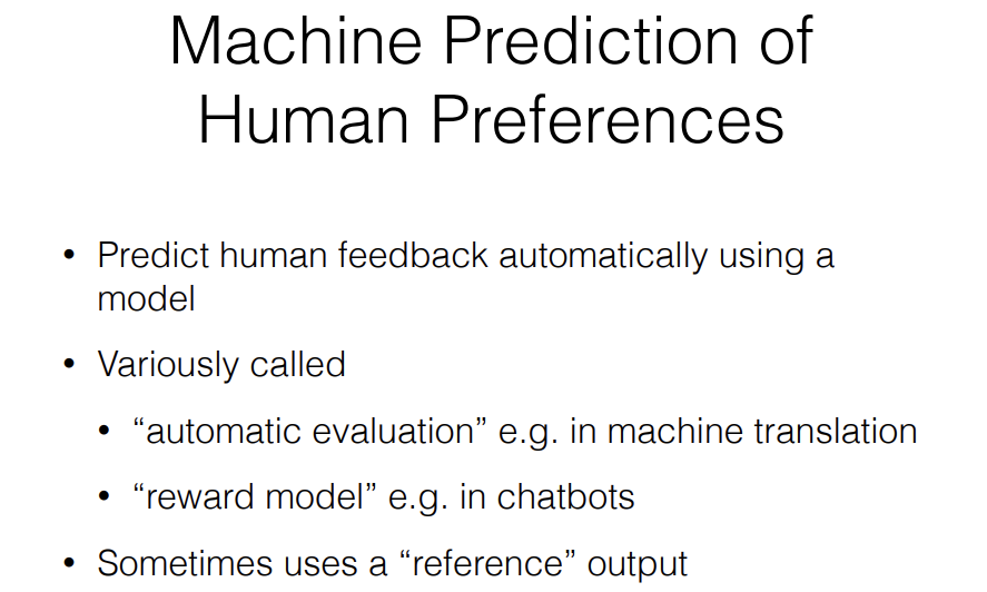 The goal of automatic evaluation is, to predict human preferences or to predict what the human scores would be. Because still at this point, we mostly view what humans think of the output to be gold standard and this is called a variety of things depending on what field you're in. In machine translation and summarization, it's called "automatic evaluation", also a lot in dialogue. If you're talking about people from reinforcement learning or chatbots, a lot of people call it "reward model" because that specifically comes from the point of view of learning from this feedback, but essentially they're the same thing.