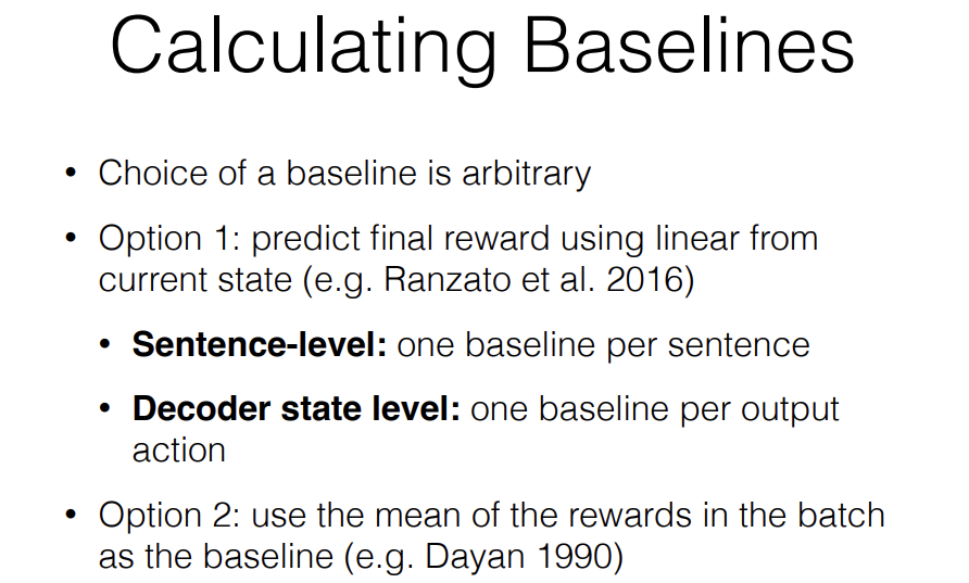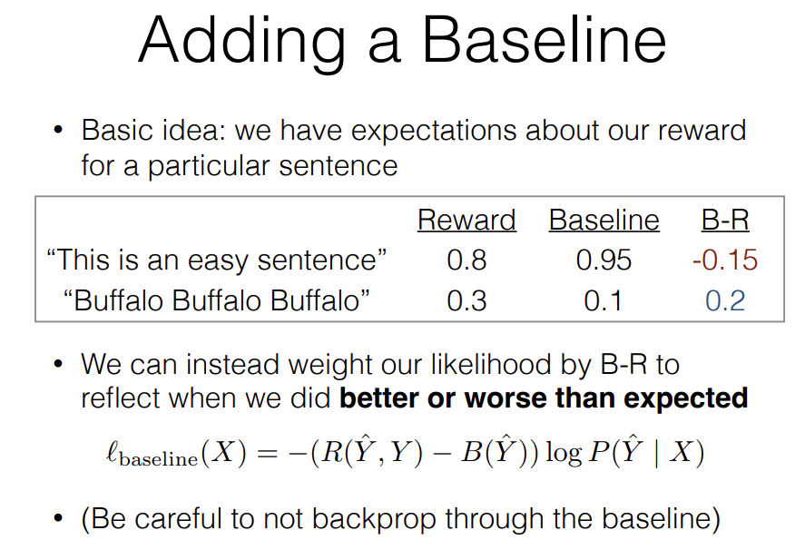 Adding a baseline. The basic idea is that, you have expectations about your reward for a particular sentence. So the basic idea is can we predict a priori how difficult this example is? and then adjust our reward based on that.