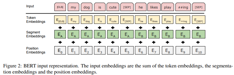 For a given token, its input representation is constructed by summing the corresponding token, segment, and position embeddings. A visualization of this construction can be seen in Figure 2.