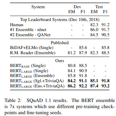 Table 2 shows top leaderboard entries as well as results from top published systems (Seo et al., 2017; Clark and Gardner, 2018; Peters et al., 2018a; Hu et al., 2018). The top results from the SQuAD leaderboard do not have up-to-date public system descriptions available,11 and are allowed to use any public data when training their systems. We therefore use modest data augmentation in our system by first fine-tuning on TriviaQA (Joshi et al., 2017) befor fine-tuning on SQuAD.