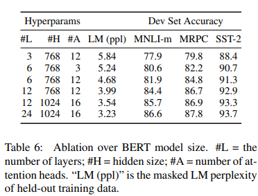 Results on selected GLUE tasks are shown in Table 6. In this table, we report the average Dev Set accuracy from 5 random restarts of fine-tuning. We can see that larger models lead to a strict accuracy improvement across all four datasets, even for MRPC which only has 3,600 labeled training examples, and is substantially different from the pre-training tasks. It is also perhaps surprising that we are able to achieve such significant improvements on top of models which are already quite large relative to the existing literature. For example, the largest Transformer explored in Vaswani et al. (2017) is (L=6, H=1024, A=16) with 100M parameters for the encoder, and the largest Transformer we have found in the literature is (L=64, H=512, A=2) with 235M parameters (Al-Rfou et al., 2018). By contrast, BERT_BASE contains 110M parameters and BERT_LARGE contains 340M parameters.