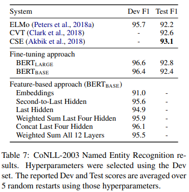 Results are presented in Table 7. BERT_LARGE performs competitively with state-of-the-art methods. The best performing method concatenates the token representations from the top four hidden layers of the pre-trained Transformer, which is only 0.3 F1 behind fine-tuning the entire model. This demonstrates that BERT is effective for both finetuning and feature-based approaches.