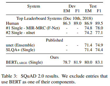 We use a simple approach to extend the SQuAD v1.1 BERT model for this task. We treat questions that do not have an answer as having an answer span with start and end at the [CLS] token. The probability space for the start and end answer span positions is extended to include the position of the [CLS] token. For prediction, we compare the score of the no-answer span: snull = S·C + E·C to the score of the best non-null span sˆi,j = maxj≥iS·Ti + E·Tj . We predict a non-null answer when sˆi,j > snull + τ , where the threshold τ is selected on the dev set to maximize F1. We did not use TriviaQA data for this model. We fine-tuned for 2 epochs with a learning rate of 5e-5 and a batch size of 48.
