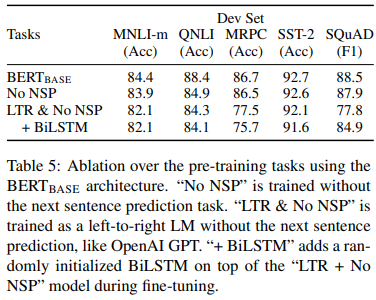 We first examine the impact brought by the NSP task. In Table 5, we show that removing NSP hurts performance significantly on QNLI, MNLI, and SQuAD 1.1. Next, we evaluate the impact of training bidirectional representations by comparing “No NSP” to “LTR & No NSP”. The LTR model performs worse than the MLM model on all tasks, with large drops on MRPC and SQuAD.