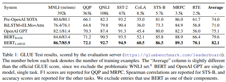 Results are presented in Table 1. Both BERT_BASE and BERT_LARGE outperform all systems on all tasks by a substantial margin, obtaining 4.5% and 7.0% respective average accuracy improvement over the prior state of the art. Note that BERT_BASE and OpenAI GPT are nearly identical in terms of model architecture apart from the attention masking. For the largest and most widely reported GLUE task, MNLI, BERT obtains a 4.6% absolute accuracy improvement. On the official GLUE leaderboard10, BERT_LARGE obtains a score of 80.5, compared to OpenAI GPT, which obtains 72.8 as of the date of writing.