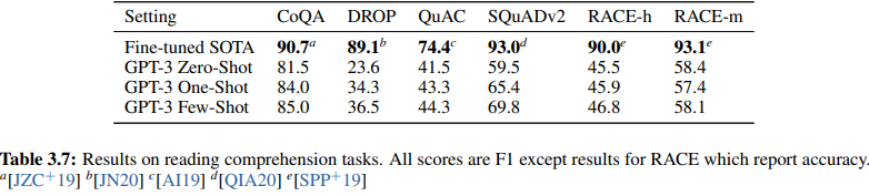 GPT-3 performs best (within 3 points of the human baseline) on CoQA [RCM19] a free-form conversational dataset and performs worst (13 F1 below an ELMo baseline) on QuAC [CHI+18] a dataset which requires modeling structured dialog acts and answer span selections of teacher-student interactions. On DROP [DWD+19], a dataset testing discrete reasoning and numeracy in the context of reading comprehension, GPT-3 in a few-shot setting outperforms the fine-tuned BERT baseline from the original paper but is still well below both human performance and state-of-the-art approaches which augment neural networks with symbolic systems [RLL+19]. On SQuAD 2.0 [RJL18], GPT-3 demonstrates its few-shot learning capabilities, improving by almost 10 F1 (to 69.8) compared to a zero-shot setting. This allows it to slightly outperform the best fine-tuned result in the original paper. On RACE [LXL+17], a multiple choice dataset of middle school and high school english examinations, GPT-3 performs relatively weakly and is only competitive with the earliest work utilizing contextual representations and is still 45% behind SOTA.