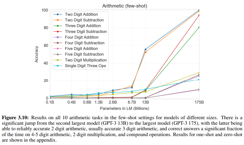 As Figure 3.10 makes clear, small models do poorly on all of these tasks – even the 13 billion parameter model (the second largest after the 175 billion full GPT-3) can solve 2 digit addition and subtraction only half the time, and all other operations less than 10% of the time.