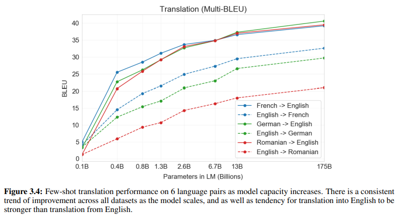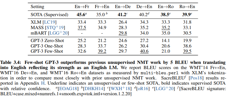 Results are shown in Table 3.4. Zero-shot GPT-3, which only receives on a natural language description of the task, still underperforms recent unsupervised NMT results. However, providing only a single example demonstration for each translation task improves performance by over 7 BLEU and nears competitive performance with prior work. GPT-3 in the full few-shot setting further improves another 4 BLEU resulting in similar average performance to prior unsupervised NMT work. GPT-3 has a noticeable skew in its performance depending on language direction. For the three input languages studied, GPT-3 significantly outperforms prior unsupervised NMT work when translating into English but underperforms when translating in the other direction. Performance on En-Ro is a noticeable outlier at over 10 BLEU worse than prior unsupervised NMT work. This could be a weakness due to reusing the byte-level BPE tokenizer of GPT-2 which was developed for an almost entirely English training dataset. For both Fr-En and De-En, few shot GPT-3 outperforms the best supervised result we could find but due to our unfamiliarity with the literature and the appearance that these are un-competitive benchmarks we do not suspect those results represent true state of the art. For Ro-En, few shot GPT-3 performs within 0.5 BLEU of the overall SOTA which is achieved by a combination of unsupervised pretraining, supervised finetuning on 608K labeled examples, and backtranslation [LHCG19b].