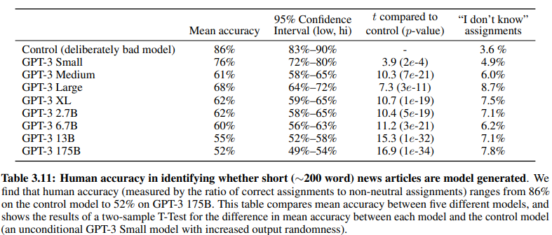 Mean human accuracy (the ratio of correct assignments to non-neutral assignments per participant) at detecting that the intentionally bad articles were model generated was ∼ 86% where 50% is chance level performance. By contrast, mean human accuracy at detecting articles that were produced by the 175B parameter model was barely above chance at ∼ 52% (see Table 3.11).5 Human abilities to detect model generated text appear to decrease as model size increases: there appears to be a trend towards chance accuracy with model size, and human detection of GPT-3 is close to chance.6 This is true despite the fact that participants spend more time on each output as model size increases (see Appendix E).