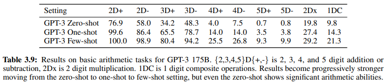 Overall, GPT-3 displays reasonable proficiency at moderately complex arithmetic in few-shot, one-shot, and even zero-shot settings.