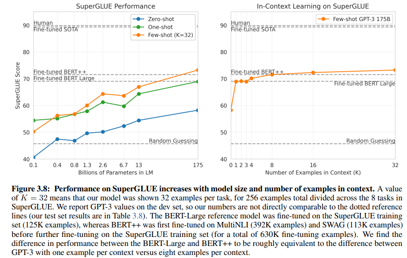Finally, we note that the few-shot SuperGLUE score steadily improves with both model size and with number of examples in the context showing increasing benefits from in-context learning (Figure 3.8). We scale K up to 32 examples per task, after which point additional examples will not reliably fit into our context. When sweeping over values of K, we find that GPT-3 requires less than eight total examples per task to outperform a fine-tuned BERT-Large on overall SuperGLUE score.