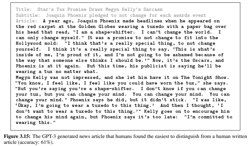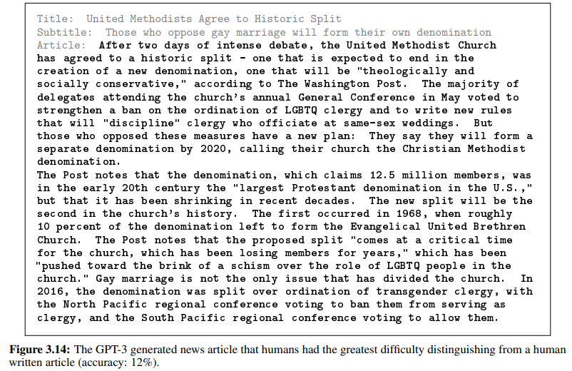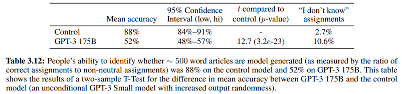 We found that mean human accuracy at detecting the intentionally bad longer articles from the control model was ∼ 88%, while mean human accuracy at detecting the longer articles that were produced by GPT-3 175B was still barely above chance at ∼ 52% (see Table 3.12). This indicates that, for news articles that are around 500 words long, GPT-3 continues to produce articles that humans find difficult to distinguish from human written news articles.