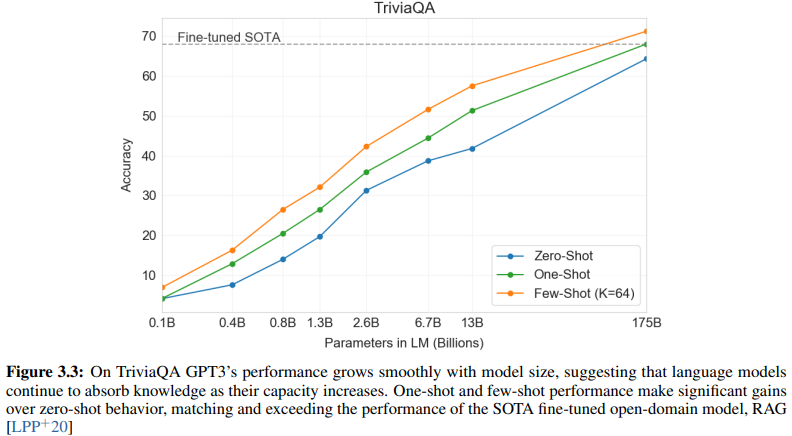 Overall, on one of the three datasets GPT-3’s one-shot matches the open-domain fine-tuning SOTA. On the other two datasets it approaches the performance of the closed-book SOTA despite not using fine-tuning. On all 3 datasets, we find that performance scales very smoothly with model size (Figure 3.3 and Appendix H Figure H.7), possibly reflecting the idea that model capacity translates directly to more ‘knowledge’ absorbed in the parameters of the model.