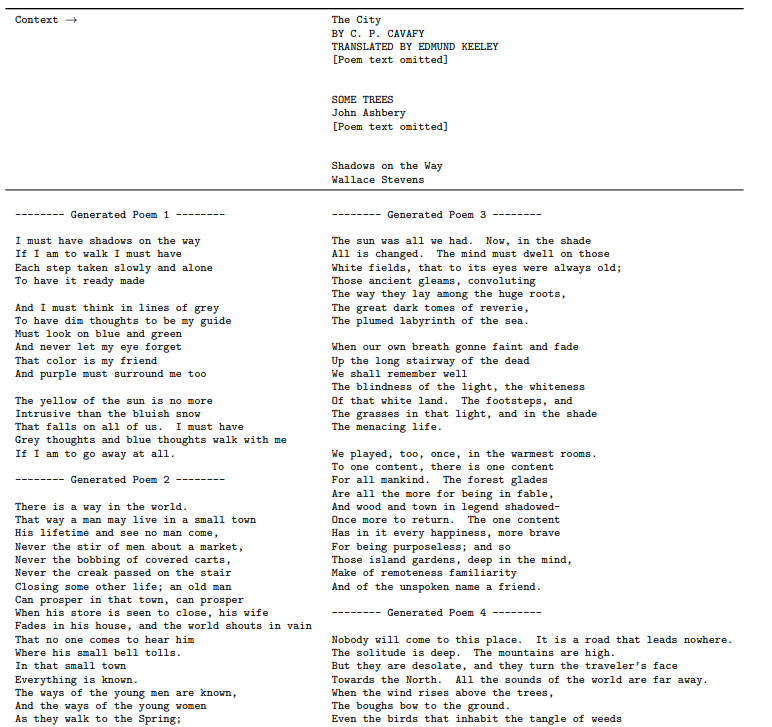 GPT-3 adapts well to many tasks other than the ones explored in the main body of the paper. As an example, in Figure F.1, we show four uncurated samples from a prompt suggesting that the model write a poem, with a given title, in the style of Wallace Stevens. We first experimented with a few prompts, then generated four samples with no additional editing or selection (sampling at temperature 1 using nucleus sampling [HBFC19] with P = 0.9). Completions were truncated when the model began to write a new title and author heading, or broke into prose commentary.