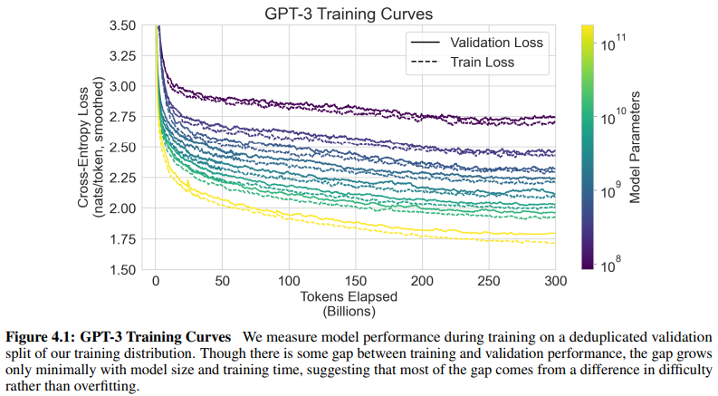 GPT-3 operates in a somewhat different regime. On the one hand, the dataset and model size are about two orders of magnitude larger than those used for GPT-2, and include a large amount of Common Crawl, creating increased potential for contamination and memorization. On the other hand, precisely due to the large amount of data, even GPT-3 175B does not overfit its training set by a significant amount, measured relative to a held-out validation set with which it was deduplicated (Figure 4.1). Thus, we expect that contamination is likely to be frequent, but that its effects may not be as large as feared.