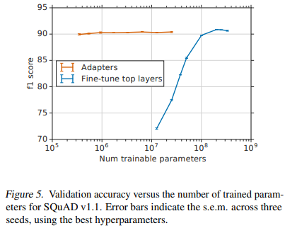 Finally, we confirm that adapters work on tasks other than classification by running on SQuAD v1.1 (Rajpurkar et al., 2018). Given a question and Wikipedia paragraph, this task requires selecting the answer span to the question from the paragraph. Figure 5 displays the parameter/performance trade-off of fine-tuning and adapters on the SQuAD validation set. For fine-tuning, we sweep the number of trained layers, learning rate in {3·10^−5 , 5·10^−5 , 1·10^−4}, and number of epochs in {2, 3, 5}. For adapters, we sweep the adapter size, learning rate in {3 · 10^−5 , 1 · 10^−4 , 3 · 10^−4 , 1 · 10^−3}, and number of epochs in {3, 10, 20}. As for classification, adapters attain performance comparable to full fine-tuning, while training many fewer parameters. Adapters of size 64 (2% parameters) attain a best F1 of 90.4%, while fine-tuning attains 90.7. SQuAD performs well even with very small adapters, those of size 2 (0.1% parameters) attain an F1 of 89.9.