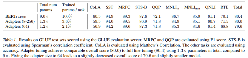 Table 1 summarizes the results. Adapters achieve a mean GLUE score of 80.0, compared to 80.4 achieved by full fine-tuning. The optimal adapter size varies per dataset. For example, 256 is chosen for MNLI, whereas for the smallest dataset, RTE, 8 is chosen. Restricting always to size 64, leads to a small decrease in average accuracy to 79.6. To solve all of the datasets in Table 1, fine-tuning requires 9× the total number of BERT parameters.4 In contrast, adapters require only 1.3× parameters.