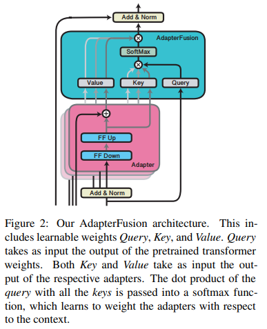 As illustrated in Figure 2, we define the AdapterFusion parameters Ψ to consist of Key, Value and Query matrices at each layer l, denoted by K_l , V_l and Q_l respectively. At each layer l of the transformer and each time-step t, the output of the feedforward sub-layer of layer l is taken as the query vector. The output of each adapter z_l,t is used as input to both the value and key transformations. Similar to attention (Bahdanau et al., 2015; Vaswani et al., 2017), we learn a contextual activation of each adapter n using