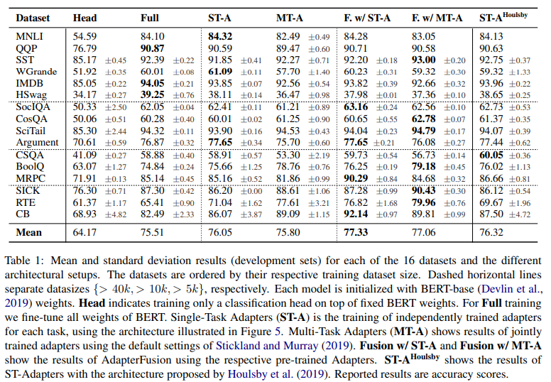 We present results for all 16 datasets in Table 1. For reference, we also include the adapter architecture of Houlsby et al. (2019), ST-AHoulsby, which has twice as many parameters compared to ST-A. To provide a fair comparison to Stickland and Murray (2019) we primarily experiment with BERT-base-uncased. We additionally validate our best model configurations — ST-A and Fusion with ST-A — with RoBERTa-base, for which we present our results in Appendix Table 4.