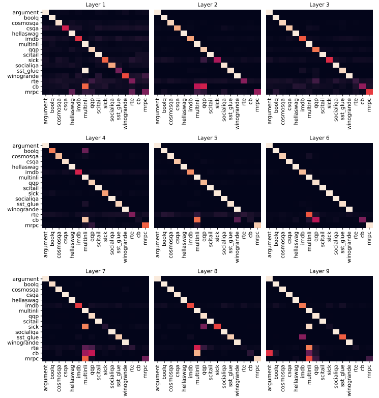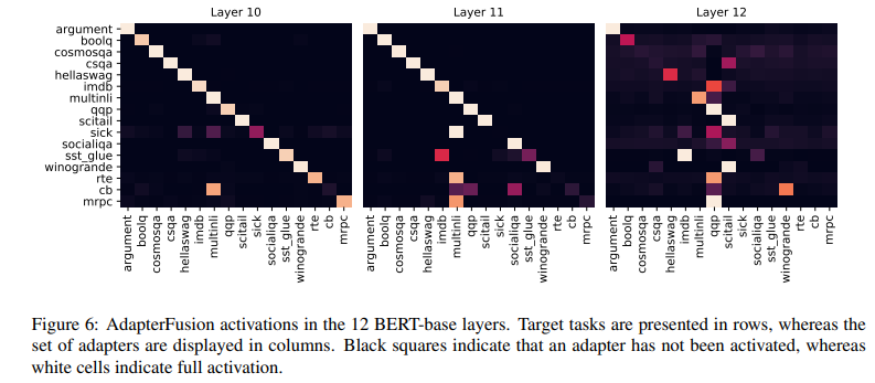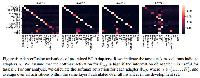 We plot the results for layers 1, 7, 9, and 12 and ST-A in Figure 4 (see Appendix Figure 6 for the remaining layers). We find that tasks which do not benefit from AdapterFusion tend to more strongly activate their own adapter at every layer (e.g. Argument, HellaSwag, MNLI, QQP, SciTail). This confirms that AdapterFusion only extracts information from adapters if they are beneficial for the target task m. We further find that MNLI is a useful intermediate task that benefits a large number of target tasks, e.g. BoolQ, SICK, CSQA, SST-2, CB, MRPC, RTE, which is in line with previous work (Phang et al., 2018; Conneau and Kiela, 2018; Reimers and Gurevych, 2019). Similarly, QQP is utilized by a large number of tasks, e.g. SICK, IMDB, RTE, CB, MRPC, SST-2. Most importantly, tasks with small datasets such as CB, RTE, and MRPC often strongly rely on adapters trained on large datasets such as MNLI and QQP.