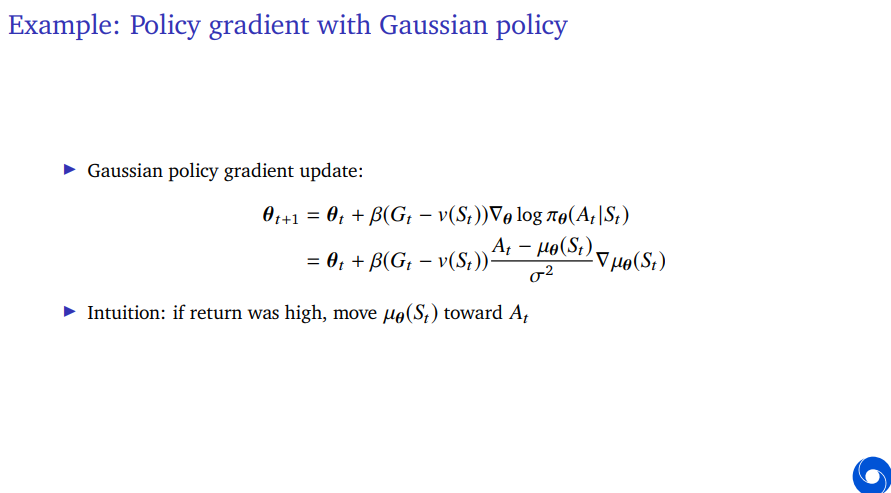 We can see that now instead of just looking at whether the return is high, we're looking, did we have a good surprise? because we're substracting baseline. The baseline does not change the expectation of the update, but it maybe makes it a little bit more interpretable. That is your return happens to be higher than you expected accroding to your value function, then you move the mean towards the action. That's what this would be doing.