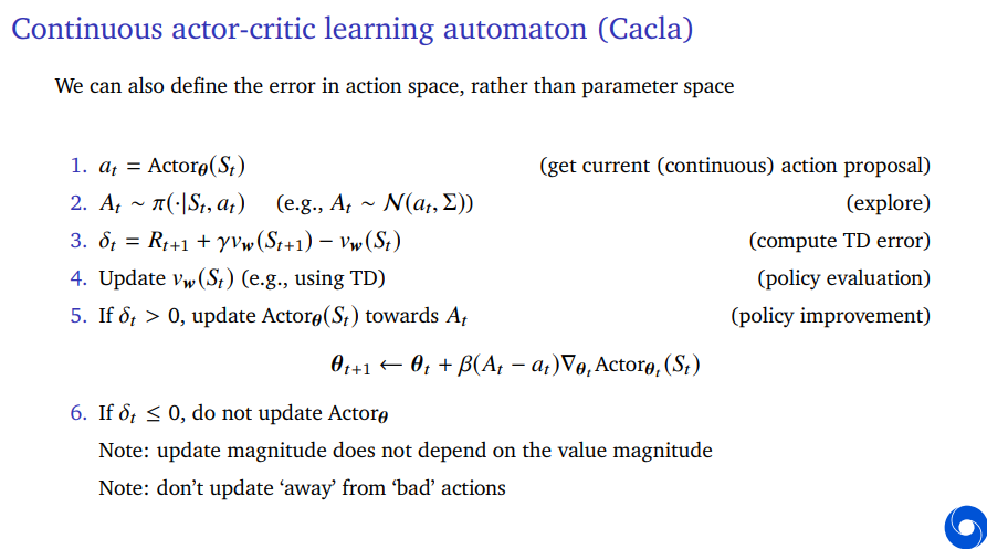 And the intuition behind this is that, maybe in order to decide how much you want to update your action, you don't want to look at how big the value is, because the value will be in completely different units from your actions. And if you're going to scale up your values or scale down your values or maybe in some states the values are just higher than others, then maybe your actor will be updated less or faster in some of those states than in others. Here instead, we're just going to look at, was the action a happy surprise? was it a good thing? was my Temporal Difference error positive? And if so, just update towards that action. So it's a slighly different algorithm. And if the Temporal Difference error is not positive, you simply don't update. That's another difference.