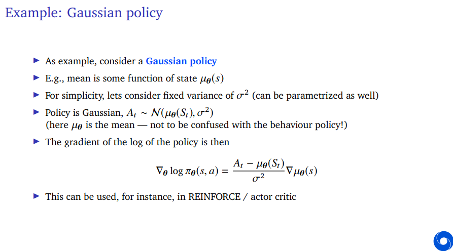 Let's consider a concrete instance of a continuous action algorithm. And to do so, we're going to parameterize our policy as a Gaussian policy which means, we're going to define some function of state which will represent the mean of our Gaussian and for simplicity, for now, we can keep it at that and we can say, there's some fixed variance. So for if this is a single dimensional policy, so we have a real-valued number and that will be our action. The mean will just be a number but it depends on state and it depends on our policy parameters theta and the variance will just be a number but we're going to consider it fixed. We could parameterize this as well. We could have policy parameters that are not just the mean of the Gaussian, but also the variance of the Gaussian. And then you could update them with policy gradients as well.