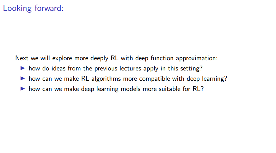 So in this chapter, we'll focusing mostly on the conceptual challenges of combining RL and deep learning and we'll mostly assume that we have these tools to support us in getting the gradients through any arbitrary neural network architecture that we may want to use for function approximation.