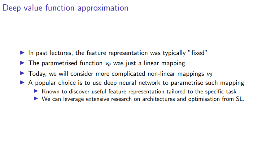 The second reaons for to consider deep neural networks is that, given the extensive adption of deep learning methods in machine learning using neural networks allows us to leverage lots of great research. So all the ideas that have been introduced in supervised learning for network architectures or optimization, we can leverage all this grace research and benefit from it when we use neural networks for function approximation in reinforcement learning.