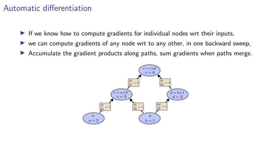 I want to stress here that the entire process is not just computationally efficient. So it's always order of the cost of doing a forward bypass but it's also exact. So this is not a numerical approximation like you could do for instance by computing the gradients by infinite differences. This is an actual way of evaluating the true gradient of an arbitrary numerical function in a fully automatic way. It's really exciting if you think about it.