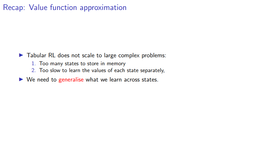 So the motivation for function approximation and the core ideas behind it is that, Tabular RL cannot possibly scale to certain large complex problems. The reason being that, if we want to estimate the value of each state separately for every single one state, this will have a memory cost that naively scales linearly with the state space which by itself would make it impractical. But even if we had unlimited memory, there was still a fundamental problem that it would be just very slow to learn the values of all states separately. So if we need to visit every single one and potentially multiple times to make an even reasonable guess of the value of the state, we are definitely in trouble.