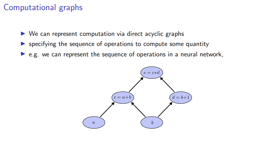 For instance, I show a very simple instance of such a computational graph where I have two inputs a and b, and I compute some intermediates representation as a+b, and b+1 respectively. This is a very simple example and then I compute some output by taking the product of these two numbers.